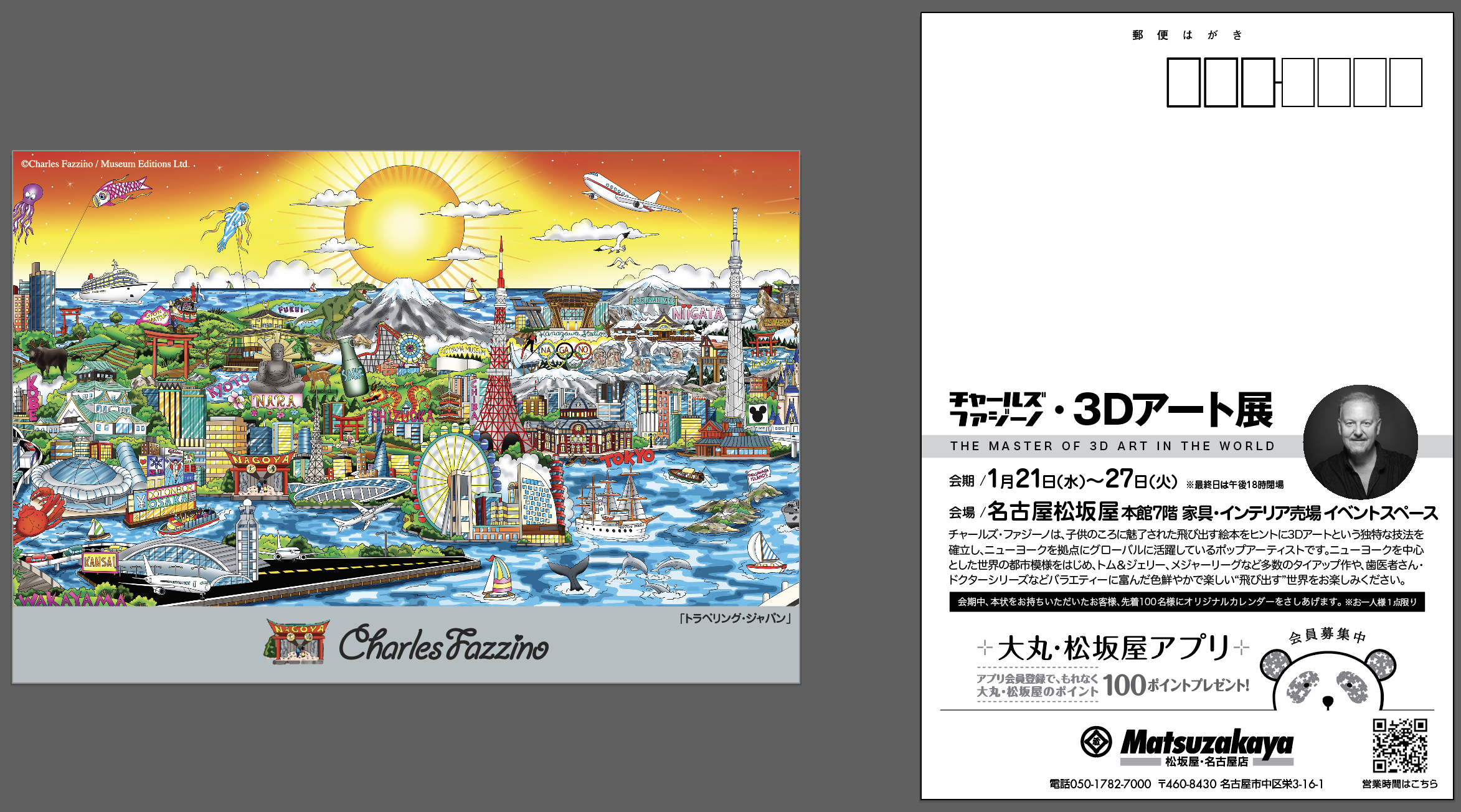 今回、松坂屋 名古屋店 本館7階 家具・インテリア売場 イベントスペースで開催する「チャールズ・ファジーノ 3Dアート展」では、後述の「トラベリング・ジャパン」をはじめ、世界各国を描いた作品や様々なコラボレーション作品等が展示される予定です。