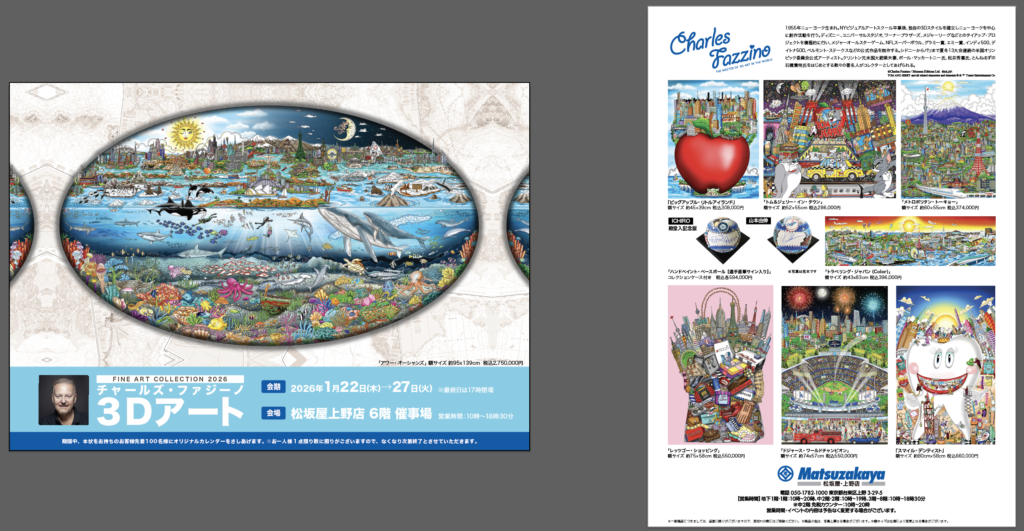本日は、松坂屋上野店 本館6階 催事場で行われる展示会情報や会場の雰囲気などご紹介していきますので、チャールズ・ファジーノ 3Dアートの世界を知っている方、まだ体験されたことがない方、興味がある方は、ぜひ足をお運びください。