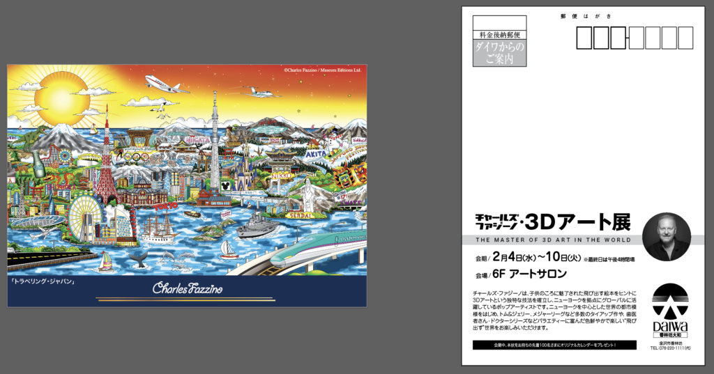 今回、大和 香林坊店 6F アートサロンで開催する「チャールズ・ファジーノ 3Dアート展」では、後述の「トラベリング・ジャパン」をはじめ、世界各国を描いた作品や様々なコラボレーション作品等が展示される予定です。