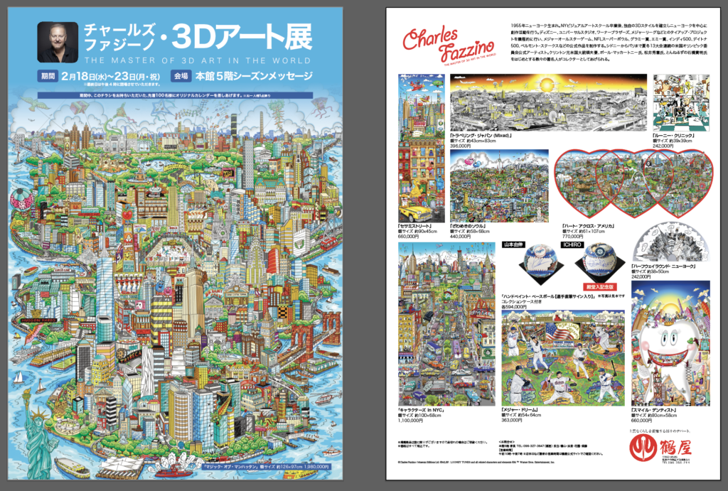 今回、鶴屋百貨店 本館5階シーズンメッセージで開催する「チャールズ・ファジーノ 3Dアート展」では、後述の「マジック・オブ・マンハッタン」をはじめ、世界各国を描いた作品や様々なコラボレーション作品等が展示される予定です。