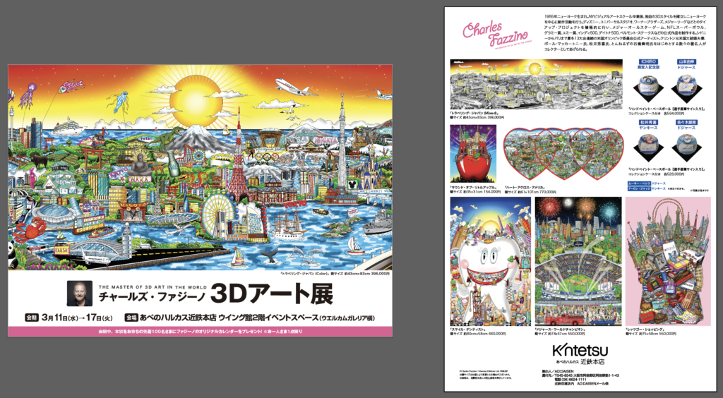 今回、あべのハルカス近鉄本店ウイング館2階 イベントスペースで開催する「チャールズ・ファジーノ 3Dアート展」では、後述の「トラベリング・ジャパン」をはじめ、世界各国を描いた作品や様々なコラボレーション作品等が展示される予定です。