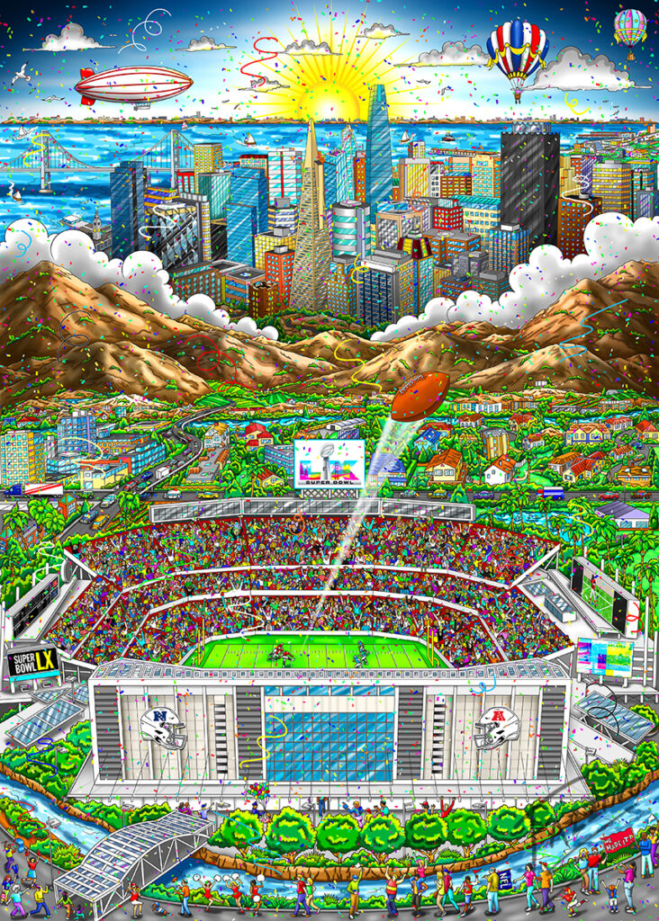 これは、2026年2月8日にサンフランシスコ・ベイエリアのリーバイス・スタジアムで開催されるスーパーボウルLXを描いた作品です。