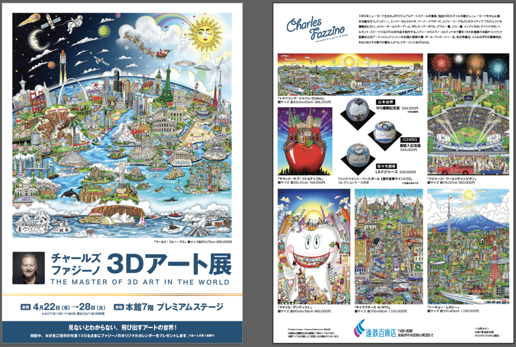 ハイスピリッツ&ユウが全国各地の百貨店にて主催する「チャールズ・ファジーノ 3Dアート展」4月22日(水)〜4月28日(火)の7日間、静岡県 浜松市にある遠鉄百貨店 本館7階 プレミアムステージにて開催されます。