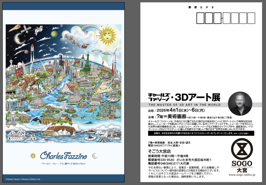 お近くに御用の方や興味がある方は、そごう大宮店 7階=美術画廊まで足を運んでいただき、ぜひこの機会にチャールズ・ファジーノ3Dアートの世界を体験してみてください!