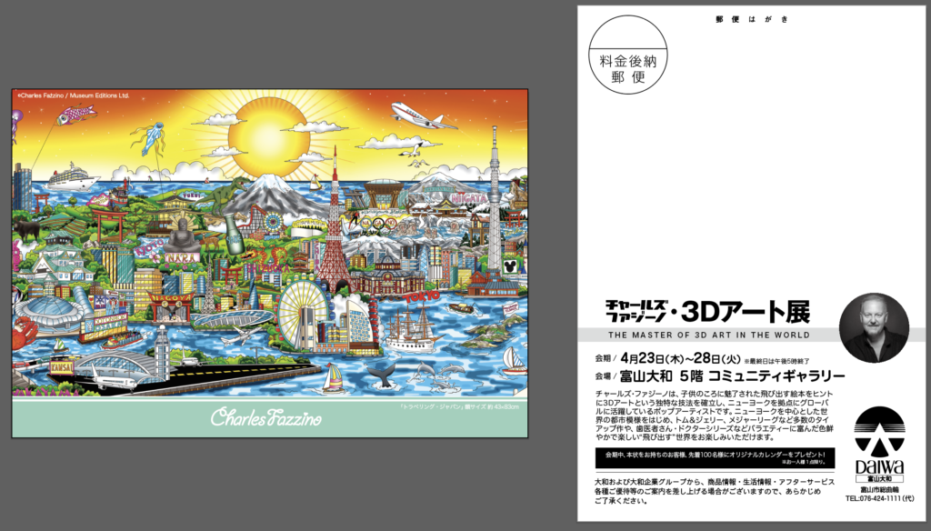 今回、大和 富山店 5階 コミュニティギャラリーで開催する「チャールズ・ファジーノ 3Dアート展」では、後述の「トラベリング・ジャパン」をはじめ、世界各国を描いた作品や様々なコラボレーション作品等が展示される予定です。