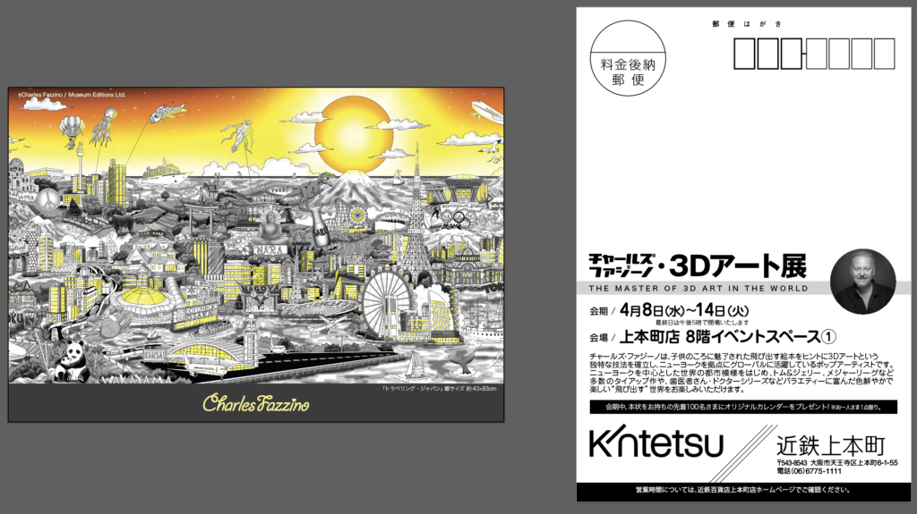今回、近鉄百貨店 上本町店 8階イベントスペース①で開催する「チャールズ・ファジーノ 3Dアート展」では、後述の「トラベリング・ジャパン」をはじめ、世界各国を描いた作品や様々なコラボレーション作品等が展示される予定です。