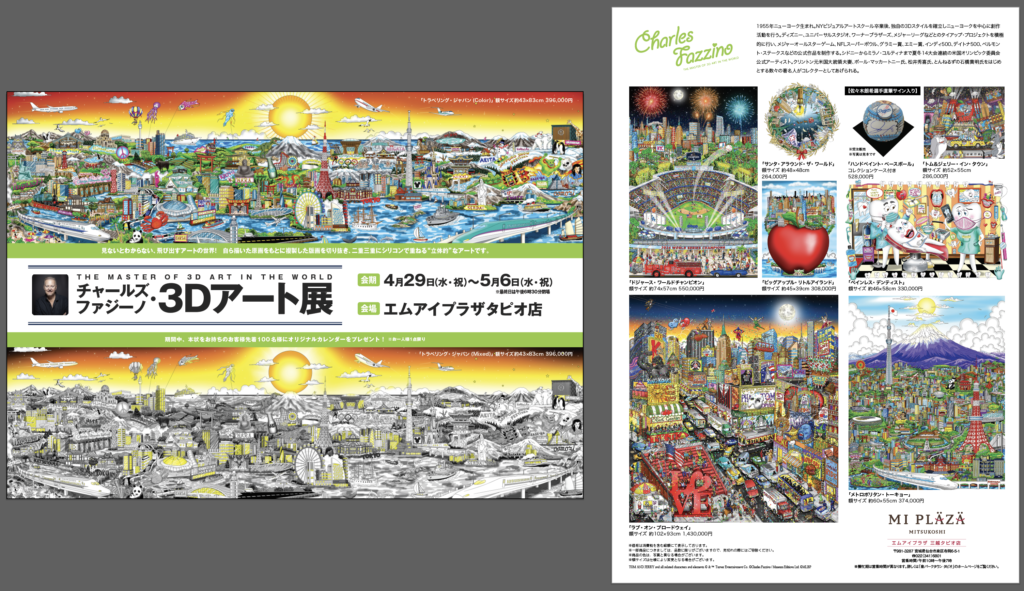 今回、MI PLAZA mitsukoshi タピオ店で開催する「チャールズ・ファジーノ 3Dアート展」では、後述の「トラベリング・ジャパン」をはじめ、世界各国を描いた作品や様々なコラボレーション作品等が展示される予定です。