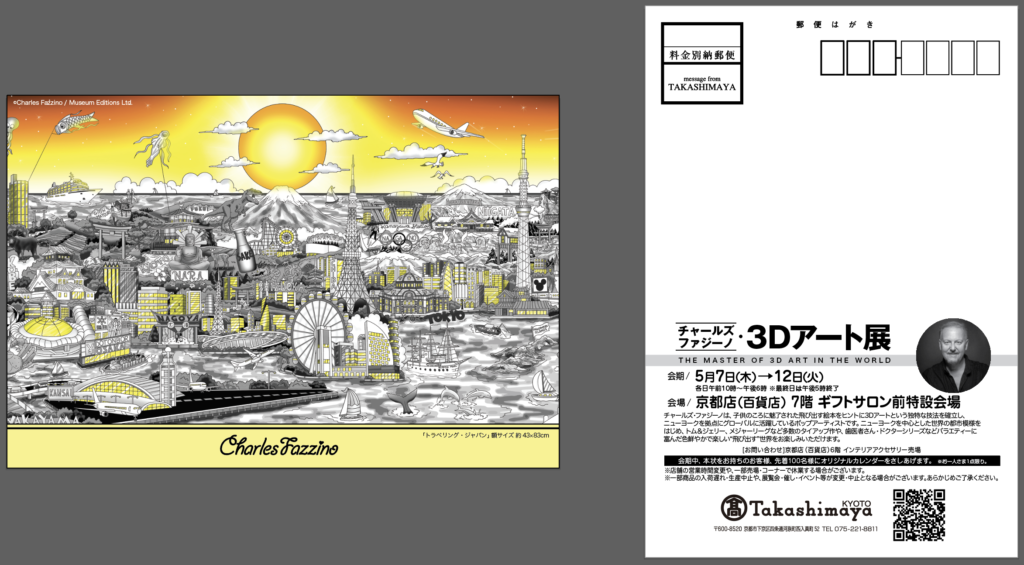 今回、京都髙島屋S.C. 7階 ギフトサロン前特設会場で開催する「チャールズ・ファジーノ 3Dアート展」では、後述の「トラベリング・ジャパン」をはじめ、世界各国を描いた作品や様々なコラボレーション作品等が展示される予定です。