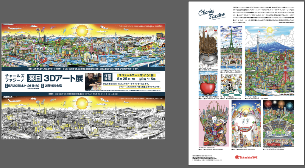 今回、高崎髙島屋 2階特設会場で開催する「チャールズ・ファジーノ 3Dアート展」では、後述の「トラベリング・ジャパン」をはじめ、世界各国を描いた作品や様々なコラボレーション作品等が展示される予定です。